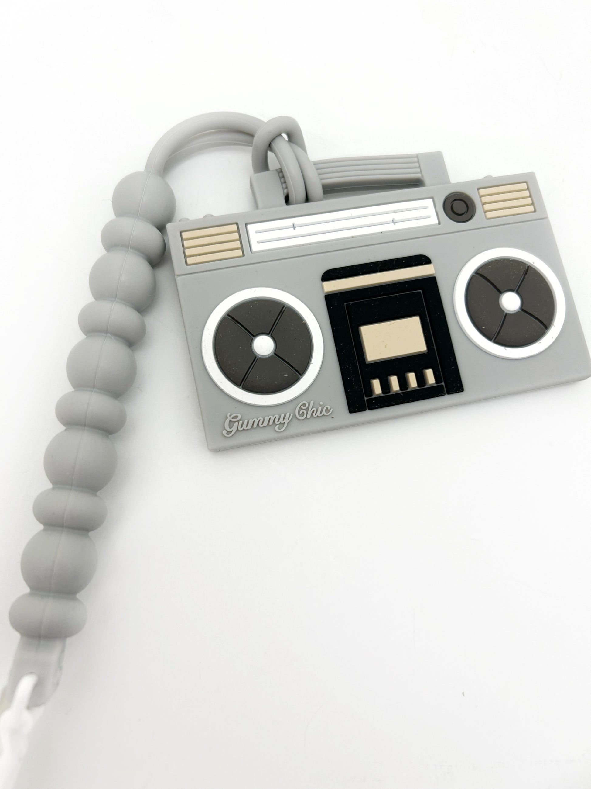 Introducing our exclusive Boom Box Teether Silicone Clip on Teether, perfect for all 80's and 90's babies out there! Designed by Gummy Chic, this teether is a nostalgic nod to the iconic boom box era.