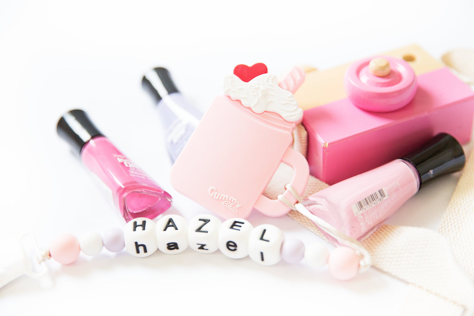 Personalize this teether by leaving a note at checkout – we recommend smaller names for a short and light pacifier clip.