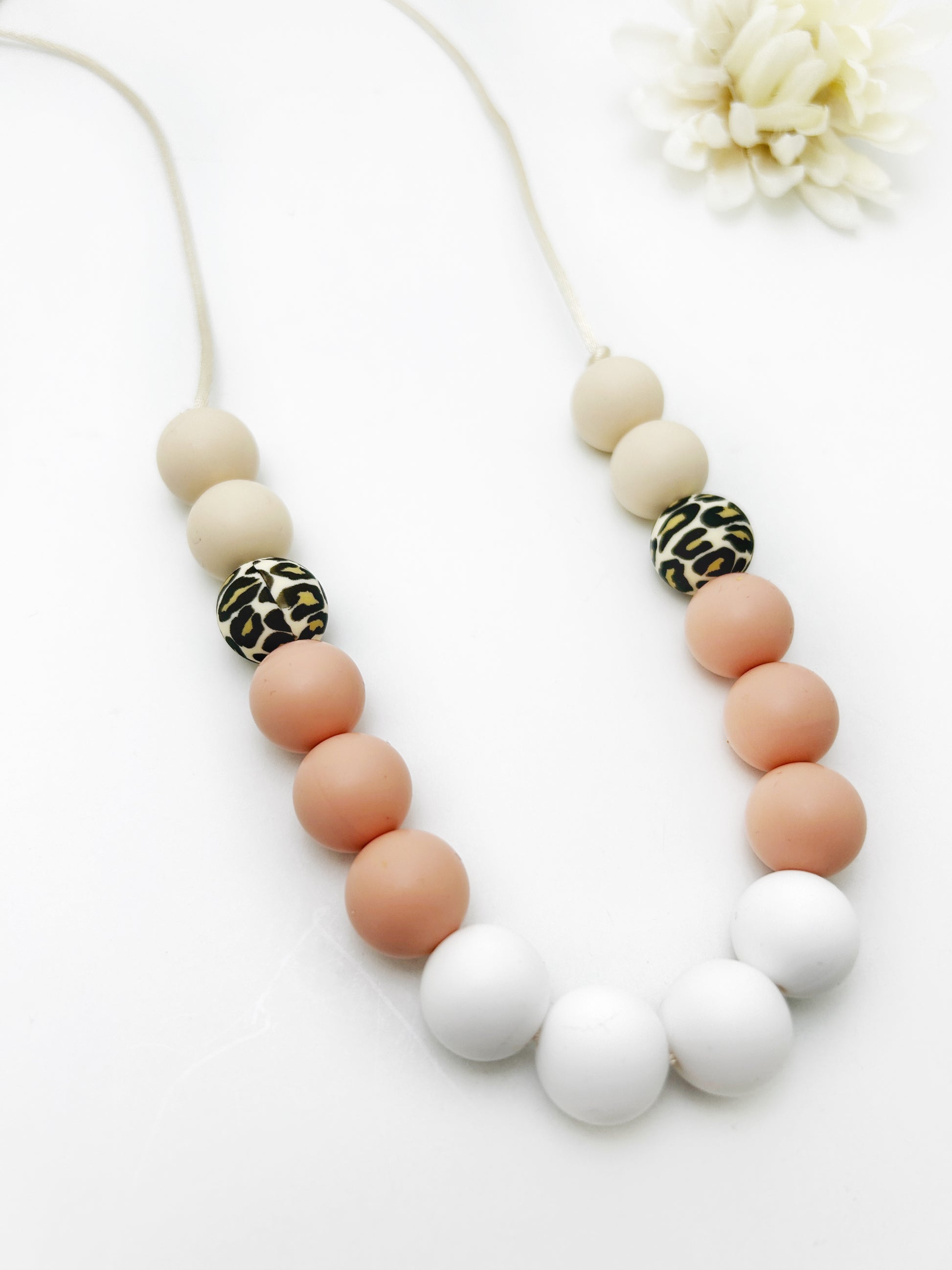 A stylish necklace for mom that doubles as a safe teether for baby. Our peach and cheetah silicone bead necklace keeps little hands busy during nursing, cuddling, and babywearing while providing soothing relief for teething gums.