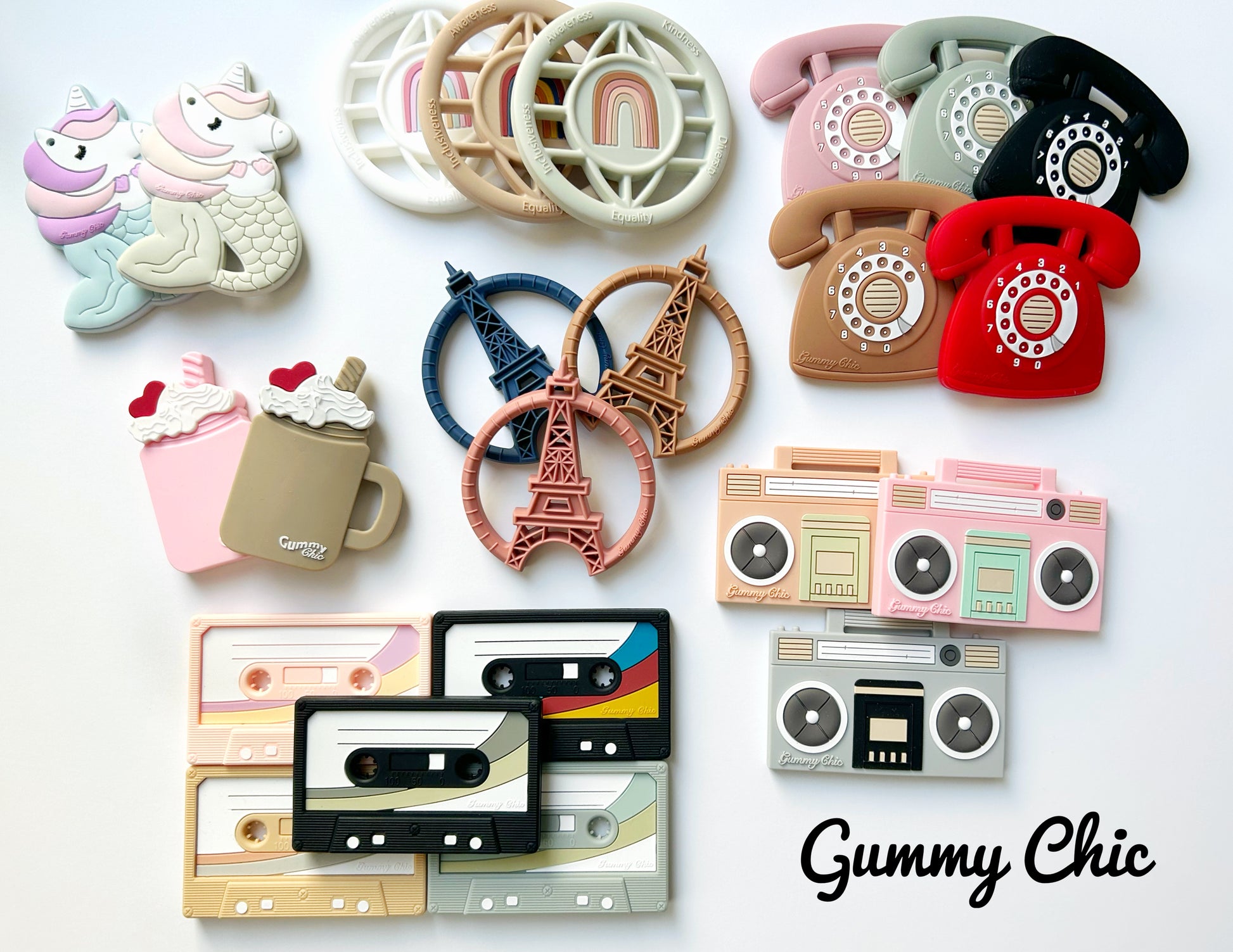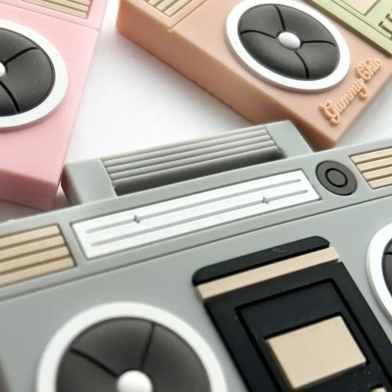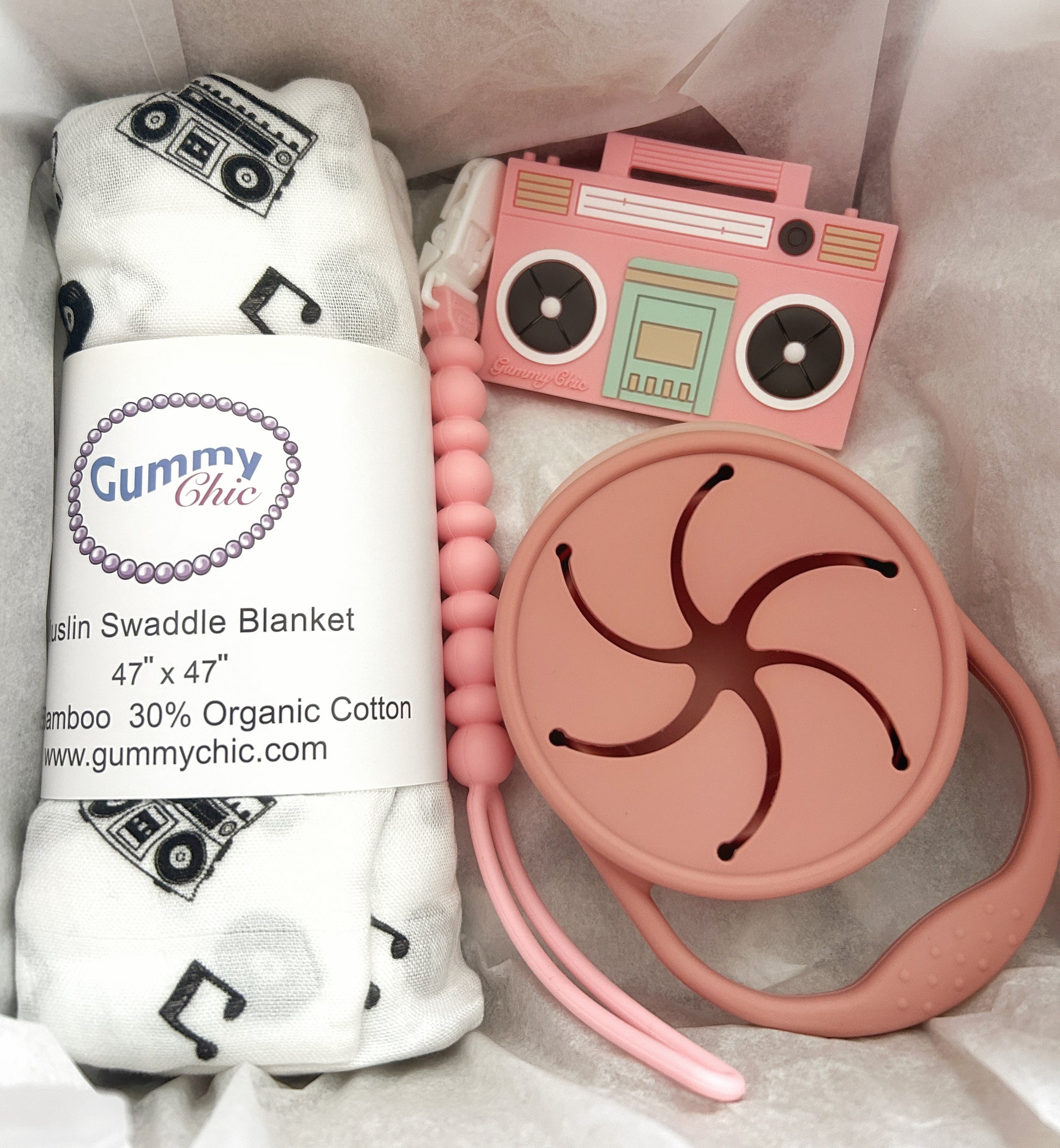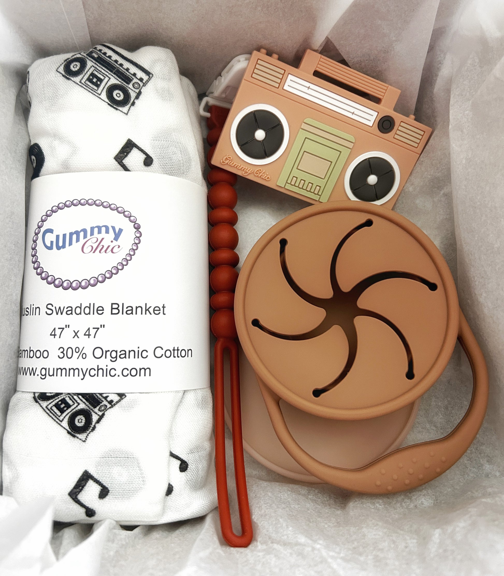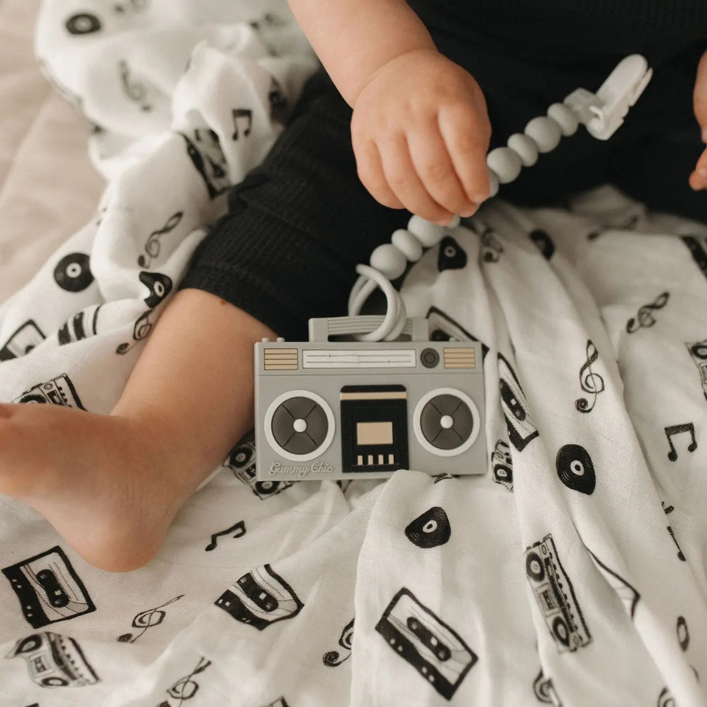 This thoughtfully curated gift box is the perfect way to welcome a new baby into the family or to delight a friend with a special present. The centerpiece of this set is our best-selling boom box tape teether from Gummy Chic, a design that captures the essence of nostalgia and style.