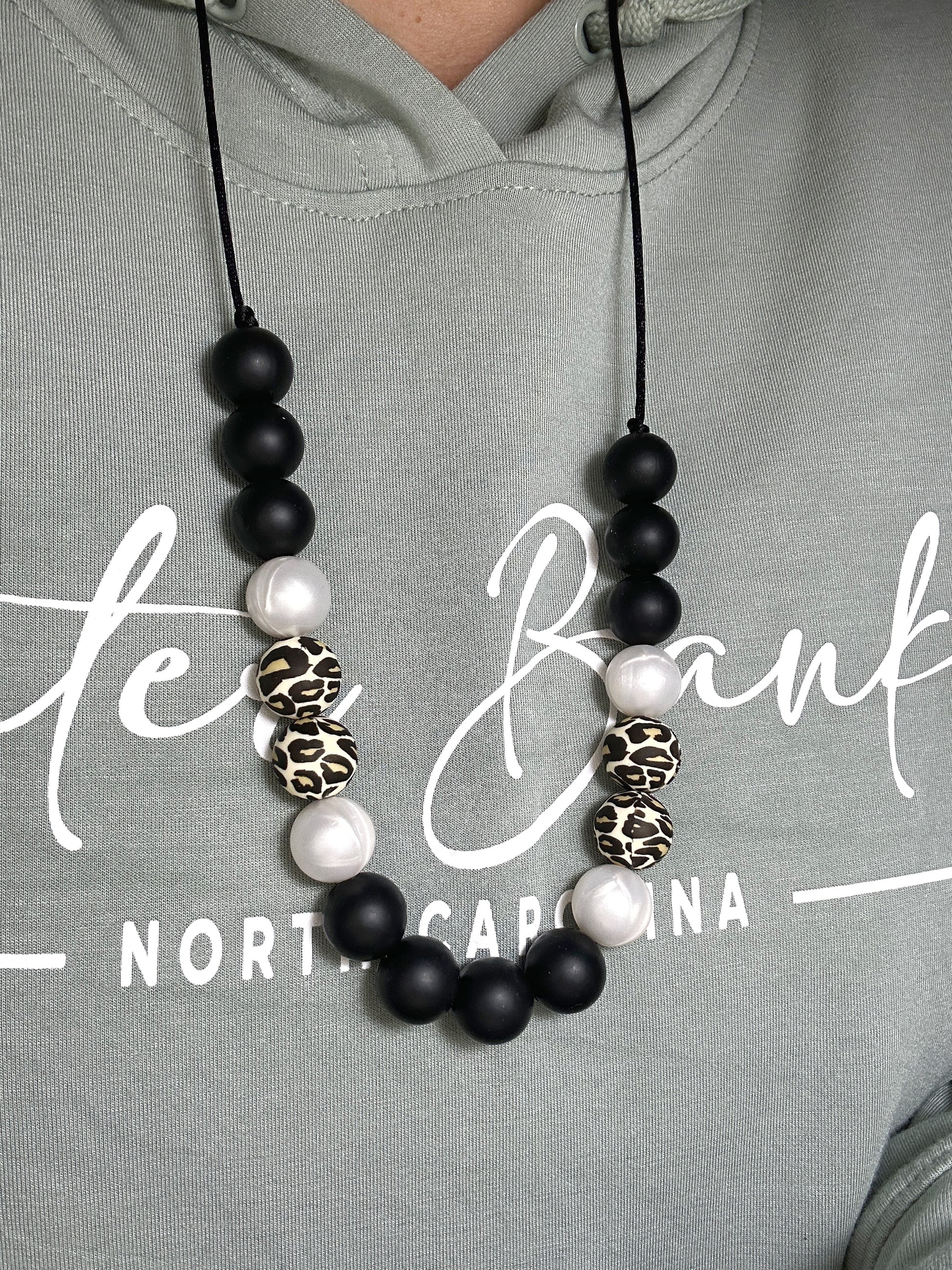 Our safe silicone teething necklaces are designed for stylish moms and happy babies. These silicone necklaces are the perfect accessory to keep your little ones entertained whether you're out and about, nursing, or babywearing. This particular style is fashionable and fits every outfit!