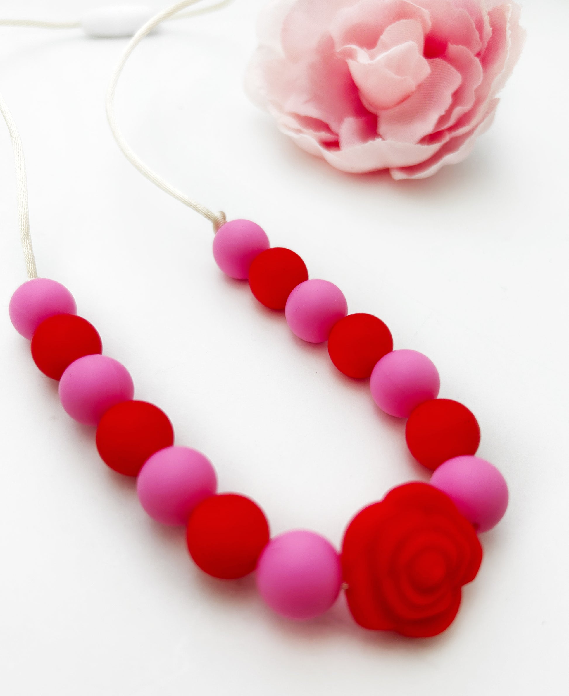 This festive chew necklace features pink and red silicone beads with a rose centerpiece—perfect for Valentine’s seasonal displays.